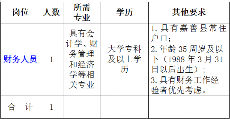因工作需要,嘉善县应急管理局向社会公开招聘1名财务人员。现将有关事项公告如下: