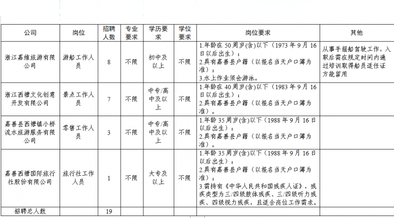 因工作需要,经研究,西塘镇下属国有公司(浙江嘉维旅游有限公司、浙江西塘文化创意开发有限公司、嘉善县西塘镇小桥流水旅游服务有限公司、嘉善西塘国际旅行社股份有限公司)决定面向社会公开招聘工作人员19名。现将有关事项公告如下: